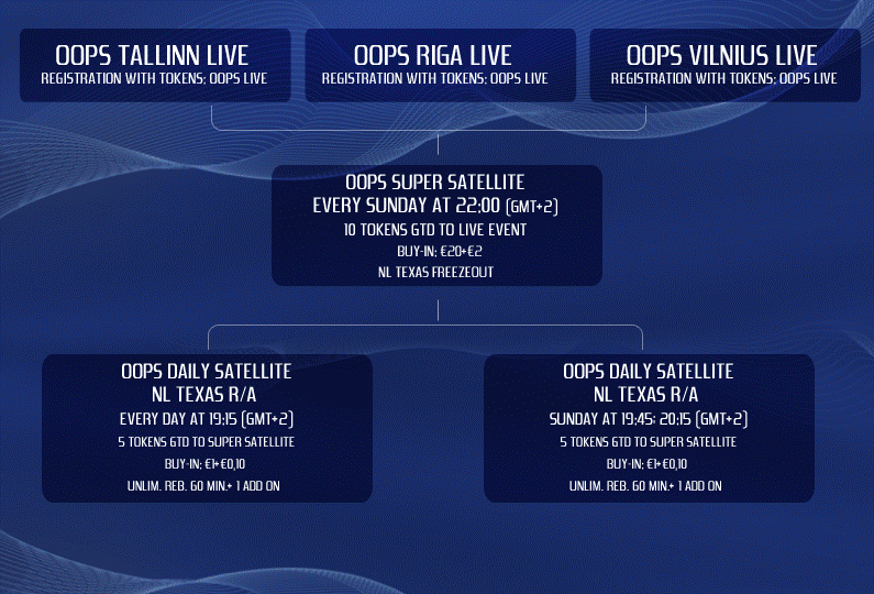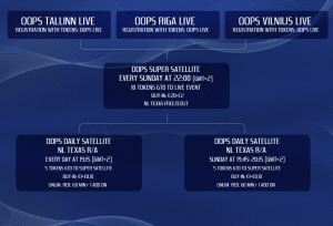 Katru mēnesi Olympic-Online Poker Series (OOPS Live) turnīri notiks Tallinā, Rīgā un Viļņā! Katram spēlētājam tiek dota iespēja izvēlēties, kurā no valstīm piedalīties turnīrā. Kvalificēties šiem turnīriem var internetā sākot no 1,1 eiro. Kvalifikācijas struktūra redzama zemāk.